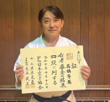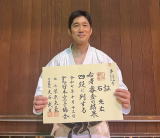 | 10月13日岡山県にて日本空手協会一般の部の昇段審査が行なわれました。 道場からは一般(成人)選手2名が審査受け、結果は2名とも見事4段合格!!! 11月末に合格証書が届き記念撮影☆ おめでとうございました! |